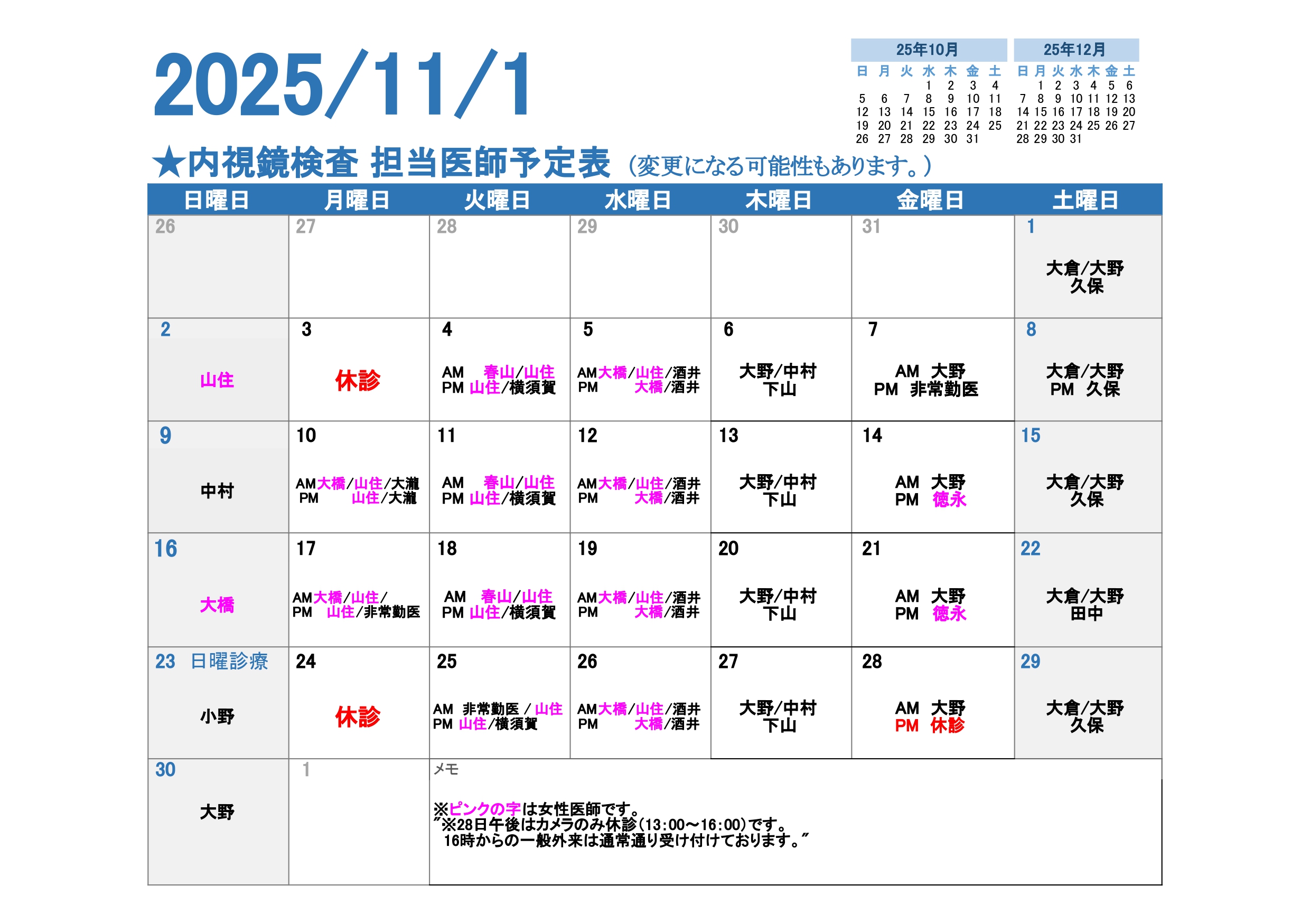 2025年11月の内視鏡検査担当医予定表です。